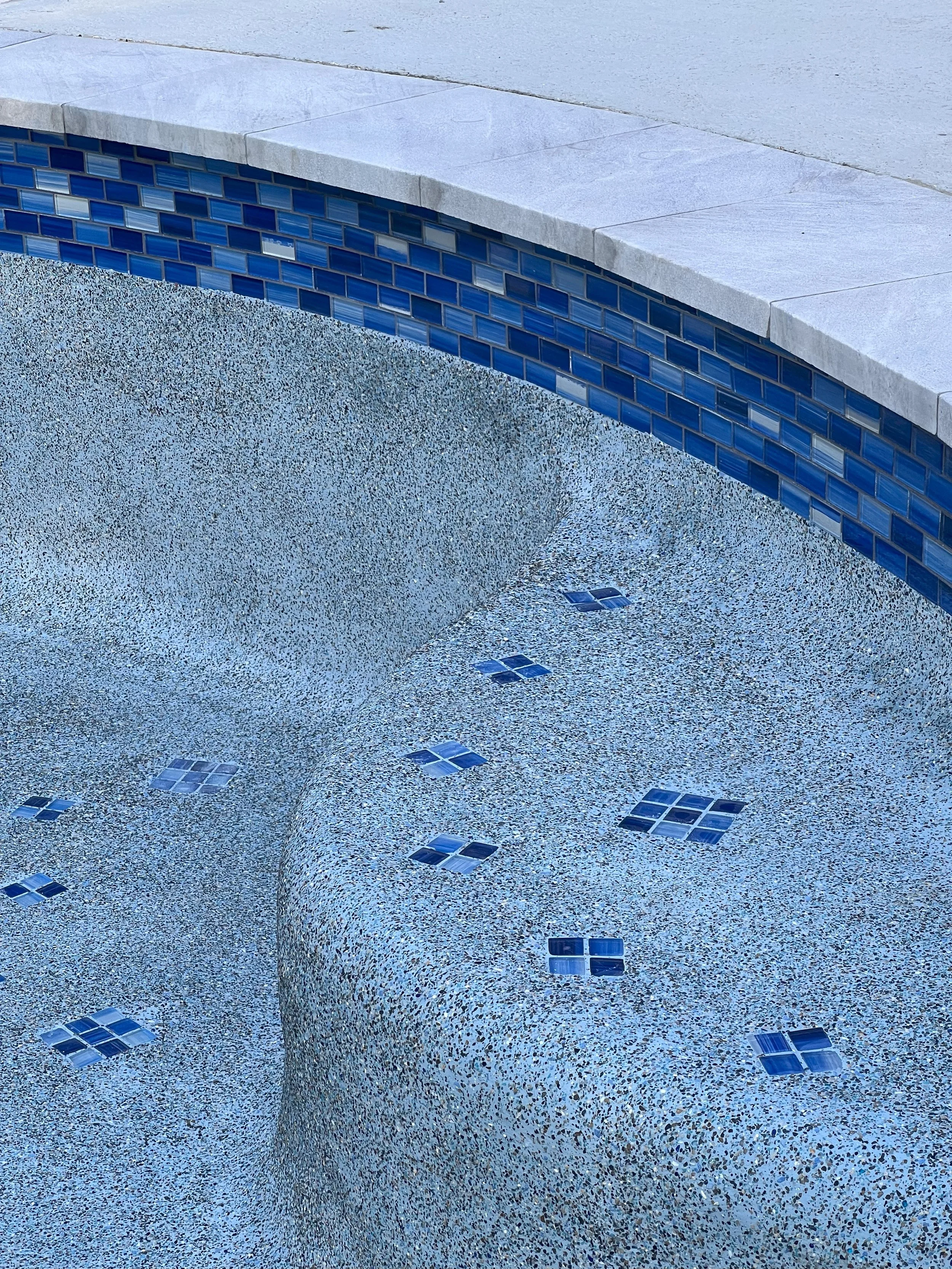 The Surface: NPT StoneScapes Mini Pebble in Aqua Blue, infused with glass beads for a subtle, iridescent glow that catches the sunlight.